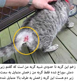 این لینک فیلمش توی آپارات هست، البته این فیلم تقریبا مال 5 روز پیشه، عکس زخم زیر دمش رو هم شب بود و باند پیچی کردم و یادم رفت بیاندازم و نشد اگر صلاح میدونید بگیرم؟