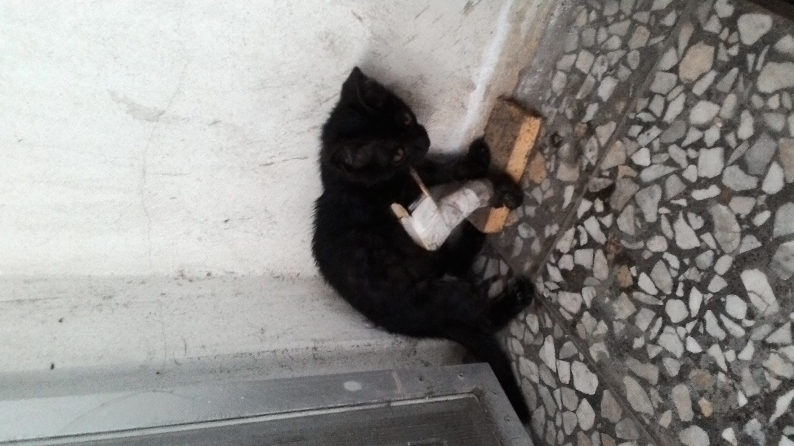 حدود 20 روز پیش یک بچه گربه بالای دیوار خونه ی ما پیداش شد که دو سه روز همون بالا بود و خیلی میو می کرد، آخر ما براش تو یه ظرف، شیر ریختیم گذاشتیم تو حیاط خونه و اومد پایین و بعد از اون کم کم با ما دوست شد. چون خیلی شیطون هم بود همیشه از همه جا بالا می رفت به همه چیز کار داشت، با ما بازی می کرد... ولی 2 شب پیش بعد از اینکه چند ساعت پیداش نبود یهو اومد و دیدیم که یک دستش از ناحیه ی کتف کاملا بی حرکته و اصلا نمی تونه تکونش بده... مثل کتف آدم که در میره... دیروز بردیمش دامپزشکی ولی متاسفانه تو این شهرستان یه دامپزشکی پیدا نمیشه که بتونه عکس رادیولوژی بگیره و دامپزشک فقط یکی از انگشت های پاش رو قطع کرد که گفت عفونی شده بود و یه پماد داد که روزی 2 بار به همون انگشت پاش بزنیم (در قسمت "درمان های جاری" توضیح دادم) و کتف دستش هم آتل گرفت و گفت یک هفته آتل بمونه و الان چون سنش کمه عصب هاش زیاد رشد نکرده و درد رو زیاد حس نمی کنه... الان پاش تقریبا سالمه و مشکلی نداره و راه میره خوب ولی دستش برای خودش آویزونه... غذا هم بهش میدیم میخوره، هنوز هم گاهی می خواد شیطونی کنه و بپره ولی خیلی کم تر و اکثر اوقات میره یه گوشه میشینه ولی برای دستشویی به همون جای همیشگی میره... دکتر گفت ممکنه دستش جوش بخوره یا شاید هم همینجوری بمونه! الان من هم نمی دونم این آتل اصلا خوب هست که باشه (؟) یا درست بسته شده (طبق عکسی که فرستادم) (؟) یا فقط گربه رو اذیت می کنه و بهتره بازش کنیم؟