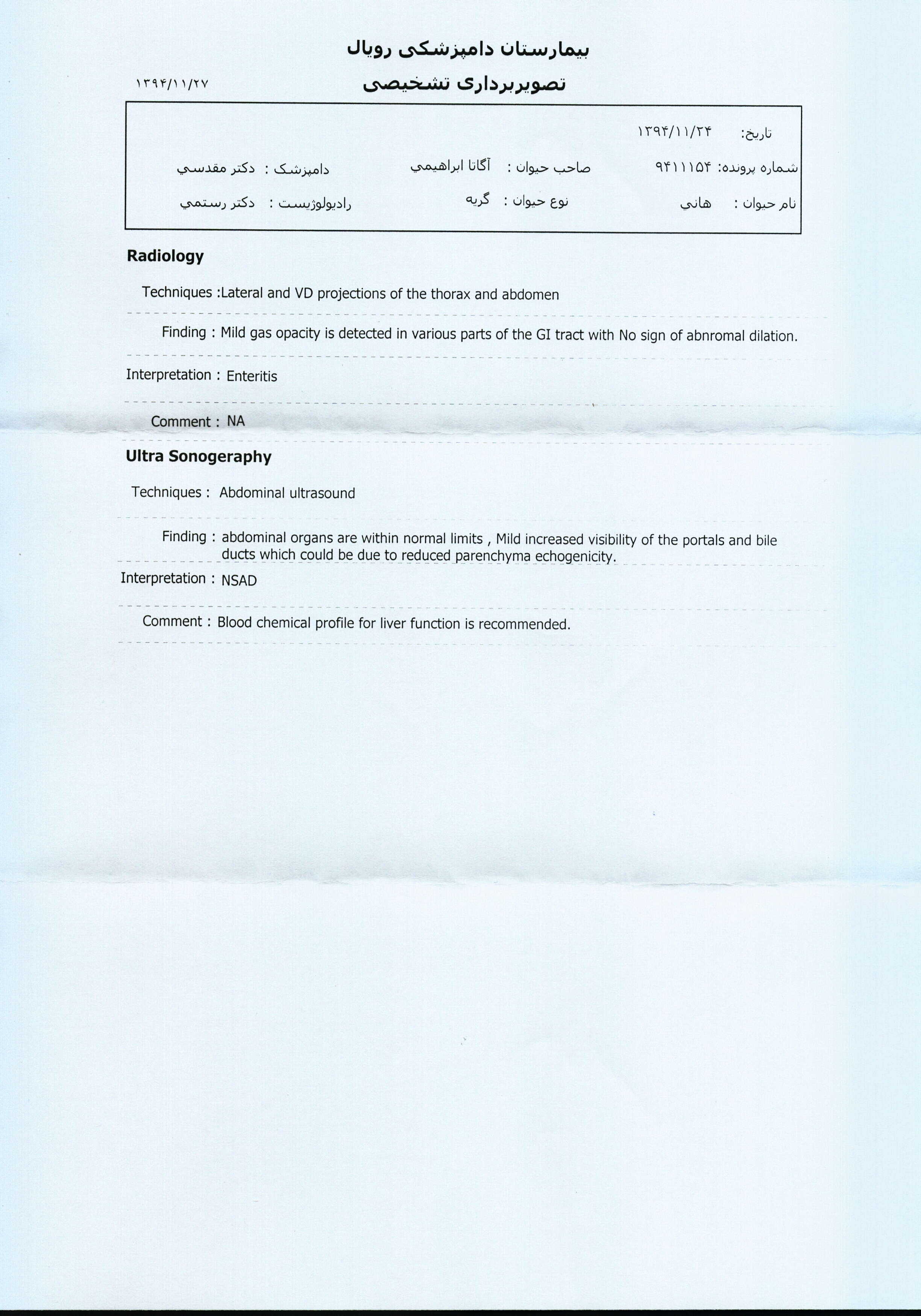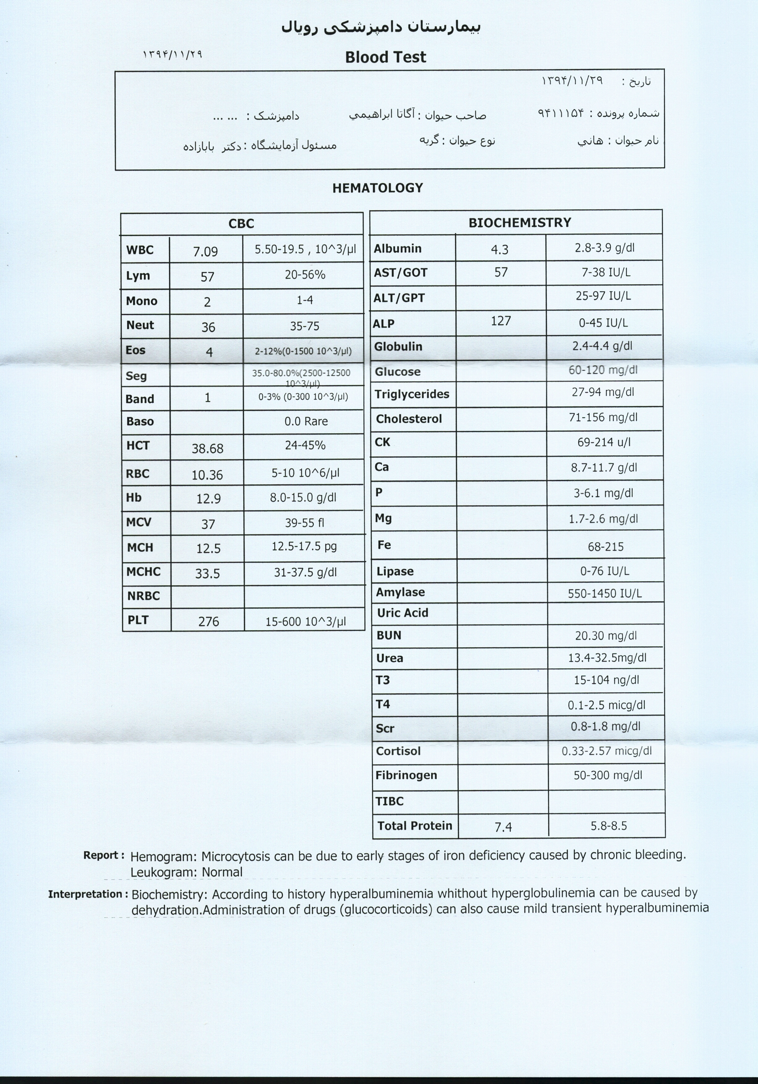 گربه 11 ماهه من حدود 2 ماهه که اسهال شده،کاملا سرحاله و غذا میخوره فقط مدفوعش حالت خمیری شکل و شل داره.به تجویز دامپزشک فنبندازول به مدت 5 روز و پس از اون دو هفته بعد مجددا فنبدازول تکرار شد ولی اسهال برطرف نشد.بعد از اون 10 روز شربت مترونید ازول تجویز شد که بازهم تاثیری نداشت.درنهایت پس از مراجعه به دامپزشکی دیگه، آزمایش خون و مدفوع، سونوگرافی و رادیوگرافی انجام شد.سه روز (هر12ساعت) سرم رینگر و پنج روز (هر12ساعت) آمپول آمپی سیلین و سفتریکسون (هربار از هرکدام 0.7 سی سی) در آنژیوکت تزریق شده.بعد از تزریق آمپولها مدفوع گربه کاملا به رنگ سیاه و از حالت خمیری قبل به شکل مایع غلیظ در اومد.دامپزشک فرمودند که در مدفوع گربه من عفونی و همراه با خون بوده.ایشون احتمال دادن گربه من مبتلا به IBS یا IBD هست.البته این روهم به صورت قطعی نگفتن و احتمال دادن.درنهایت گفتن شاید لازم به بیوپسی باشه.درحال حاضر 48 ساعت هست که تزریق آمپولها قطع شده و مدفوع گربه ام به حالت خمیری قبل برگشته.من واقعا نمی دونم مشکل این گربه چی هست و خیلی نگران هستم.عاجزانه ازتون خواهش میکنم منو راهنمایی کنید.گزارش سونوگرافی و رادیوگرافی و آزمایشاتش رو ضمیمه میکنم.این هم اضافه کنم که گربه من همیشه مرغ پخته و غذای خشک میخورد و هیچوقت تغییر رژیم غذایی نداشته.درحال حاضر فقط مرغ پخته شده و غذای گاستریت رویال کنین میخوره .تمامی واکسن هاش هم زده شده.سپاسگزارم( این سوال 10 سال قبل مطرح شد و 10 سال قبل به این سوال پاسخ داده شده است. )