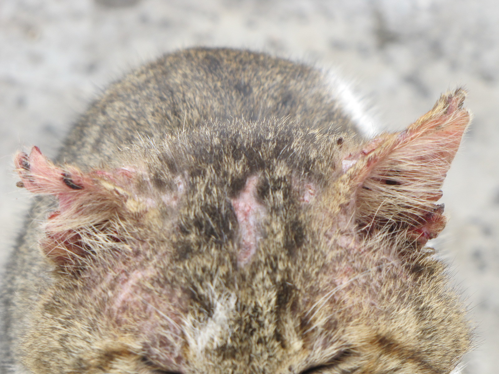 مورد 2:گربه ی نر مسن,به نظر من 5-6 ساله ست.بسیار پرخاشگر و دعوایی.نزدیک به 9 ماهه که موهای اطراف گوش هایش کاملا ریخته.پوست سر و روی گوش ها به شدت زبر و خشن شده.هر وقت دعوا میکنه گوشهاش زخمی و کنده میشه و خیلی دیر خوب میشه.روی قسمتهای کچل سر,رگه های خونی دیده میشه.این گربه هم کاملا غذا میخوره.یکبار هم اگر خاطرتون باشه به علت لایه ی کدری که روی چشمش افتاده ازتون پرسیدم که گفتین زخم قرنیه ست.این روزها که فضل جفت گیری اش هست به شدت لاغر و ضعیف شده.