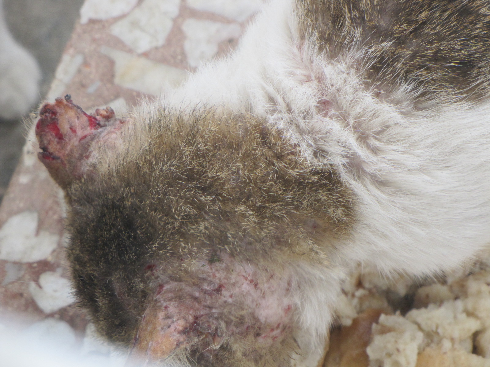 گربه ی دوم ,همونطور که توضیح دادم, دچار التهابات فراوانی در ناحیه ی گوش و پهلوی صورت هست.این عکسها هم البته مربوط به قبل هست.در حال حاضر زخمها برطرف شده.از اسپری تتراسایکلین استفاده کردم.فقط دور گوشش حالت خوردگی داره و کمی هم ملتهب و بدون مو هست.