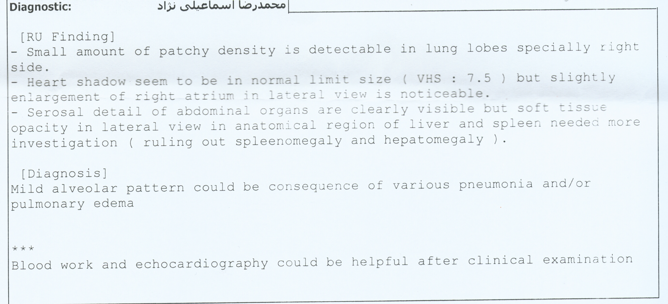 باعرض سلام و خسته نباشید.گربه 5.5 ماهه ای دارم که هنگام بازی کردن و دویدن به نفس نفس می افته و بعضی وقتها هم صدای عجیبی از خودش درمیاره و یا هنگام خواب هم صدایی شبیه غر غر کردن از خودش درمیاره.البته نمی دونم این صداها طبیعیه یا می توه مربوط به بیماریش باشه.وقتی برای زدن واکسن به دامپزشکی مراجعه کرده بودم هنگام معاینه دامپزشک فرمودن که ریه های گربه م کمی حساس شده ولی دارویی تجویز نکردن و توصیه کردن از دود سیگار دور نگهش دارم و گفتن یه عکس از ریه برای تشخیص بهتر گرفته بشه.میخواستم نظر شما رو در مورد عکس و گزارش رادیولوژی که ضمیمه کردم بدونم و توصیه ها و یا درمان خاصی اگر لازم هست لطفا بفرمایید.( این سوال 10 سال قبل مطرح شد و 10 سال قبل به این سوال پاسخ داده شده است. )